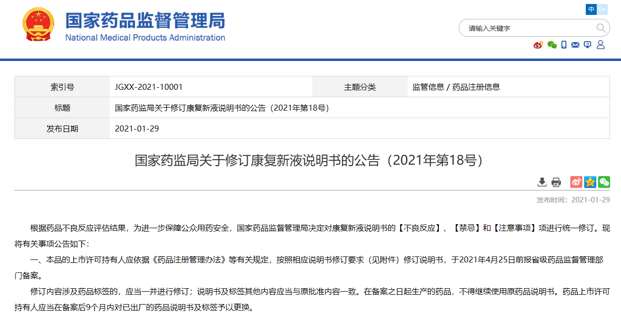 關(guān)于修訂康復(fù)新液說明書的公告(2021年第18號(hào))
