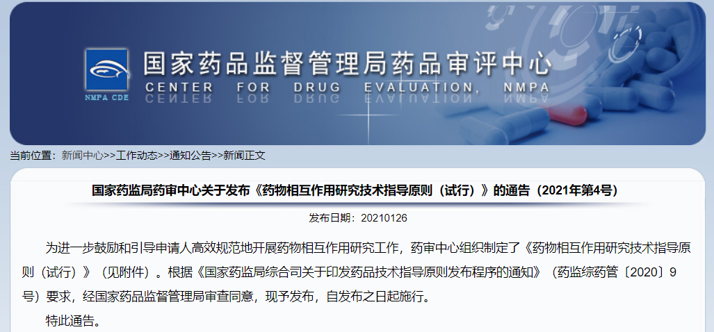 關(guān)于發(fā)布《藥物相互作用研究技術(shù)指導(dǎo)原則(試行)》的通告(2021年第4號(hào))