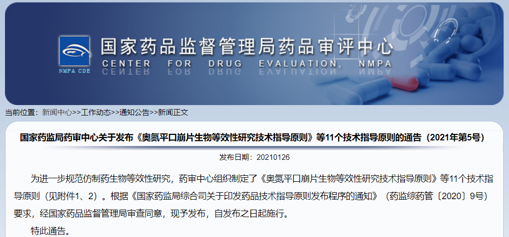 關(guān)于發(fā)布《奧氮平口崩片生物等效性研究技術(shù)指導(dǎo)原則》等11個(gè)技術(shù)指導(dǎo)原則的通告(2021年第5號(hào))