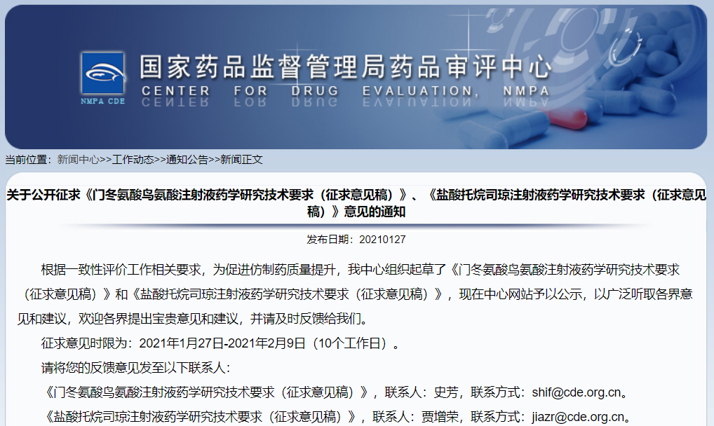 關(guān)于公開征求《門冬氨酸鳥氨酸注射液藥學(xué)研究技術(shù)要求(征求意見稿)》、《鹽酸托烷司瓊注射液藥學(xué)研究技術(shù)要求(征求意見稿)》意見的通知