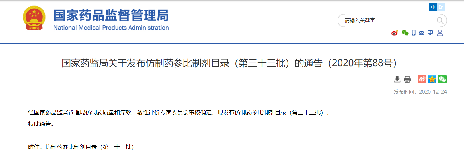 關于發布仿制藥參比制劑目錄(第三十三批)的通告(2020年第88號)