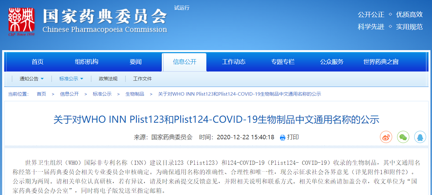 關于對WHO INN Plist123和Plist124-COVID-19生物制品中文通用名稱的公示