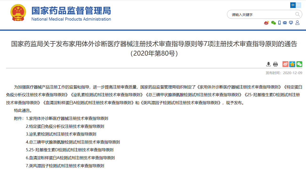 關于發布家用體外診斷醫療器械注冊技術審查指導原則等7項注冊技術審查指導原則的通告(2020年第80號)
