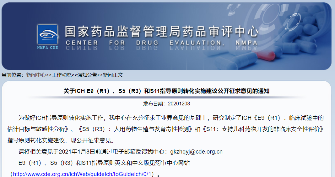 臨床試驗中的估計目標與敏感性分析》、《S5(R3):人用藥物生殖與發育毒性檢測》和《S11:支持兒科藥物開發的非臨床安全性評價》指導原則轉化實施建議,現公開征求意見至2021年1月8日。