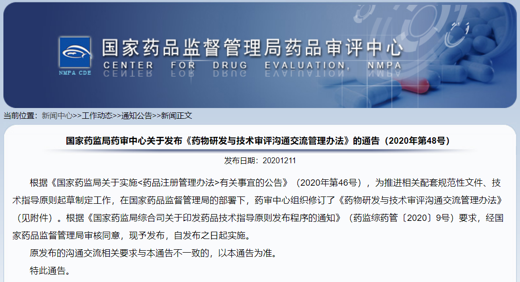 關于發布《藥物研發與技術審評溝通交流管理辦法》的通告(2020年第48號)
