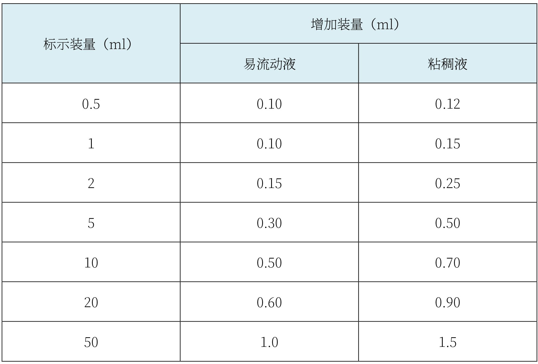 Chp2020版通則<0102>關于注射劑過量灌裝體積的規定與USP基本一致:注射劑的灌裝標示量不大于50ml時,可參考下表適當增加裝量。