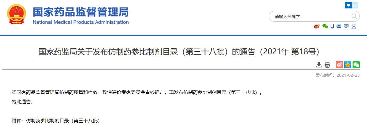 關于發布仿制藥參比制劑目錄(第三十八批)的通告(2021年 第18號)