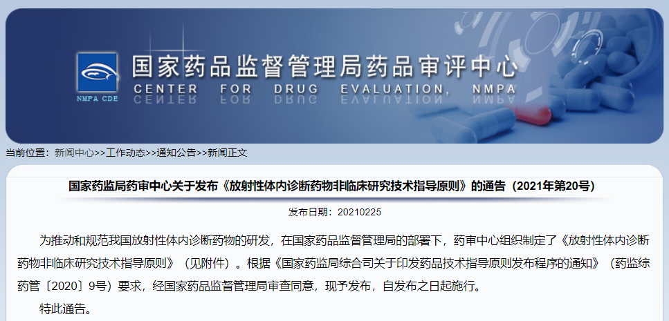 關于發布《放射性體內診斷藥物非臨床研究技術指導原則》的通告(2021年第20號)