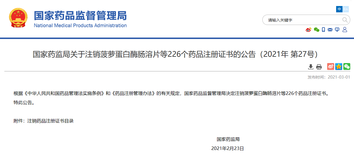 國(guó)家藥監(jiān)局關(guān)于注銷(xiāo)菠蘿蛋白酶腸溶片等226個(gè)藥品注冊(cè)證書(shū)的公告(2021年 第27號(hào))