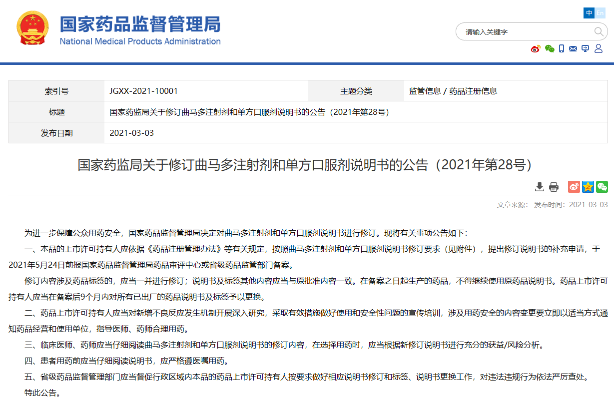 關(guān)于修訂曲馬多注射劑和單方口服劑說(shuō)明書(shū)的公告(2021年第28號(hào))