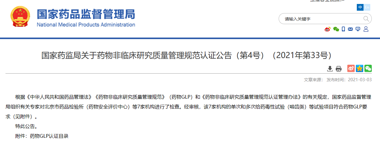 關(guān)于藥物非臨床研究質(zhì)量管理規(guī)范認(rèn)證公告(第4號(hào))(2021年第33號(hào))