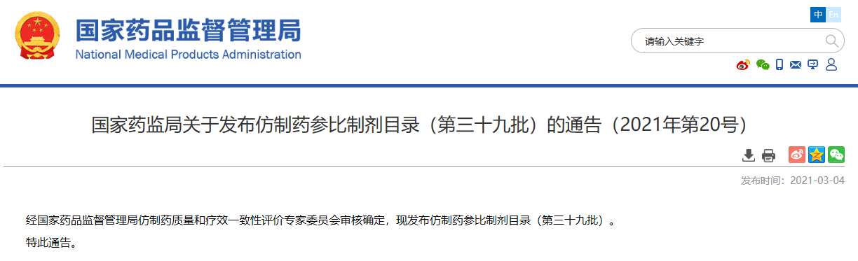 關(guān)于發(fā)布仿制藥參比制劑目錄(第三十九批)的通告(2021年第20號(hào))