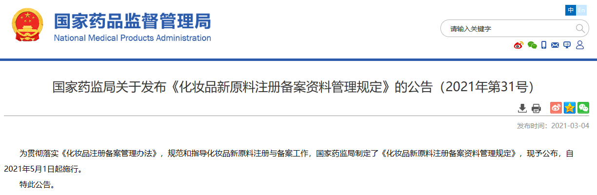 發(fā)布《化妝品新原料注冊(cè)備案資料管理規(guī)定》的公告(2021年第31號(hào))