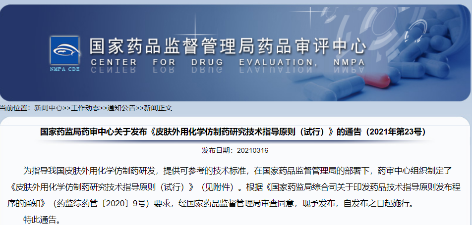 關(guān)于發(fā)布《皮膚外用化學(xué)仿制藥研究技術(shù)指導(dǎo)原則(試行)》的通告(2021年第23號(hào))
