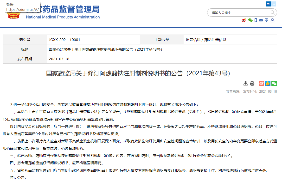 關(guān)于修訂阿魏酸鈉注射制劑說明書的公告(2021年第43號(hào))