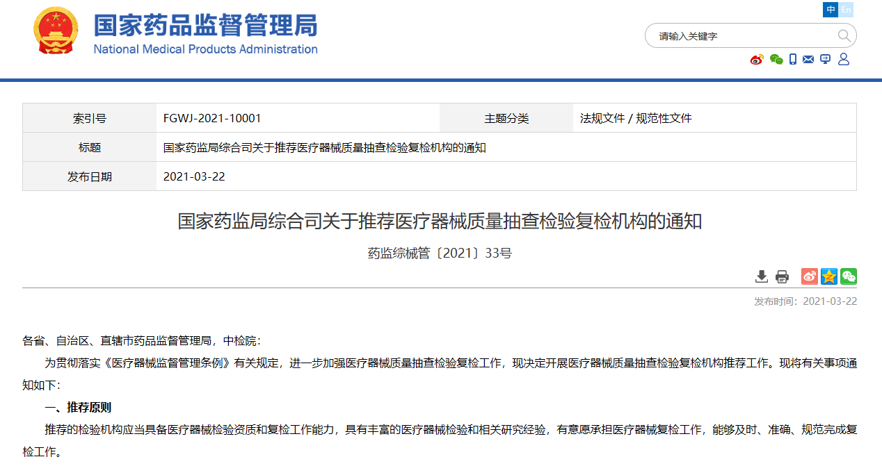 國(guó)家藥監(jiān)局綜合司關(guān)于推薦醫(yī)療器械質(zhì)量抽查檢驗(yàn)復(fù)檢機(jī)構(gòu)的通知