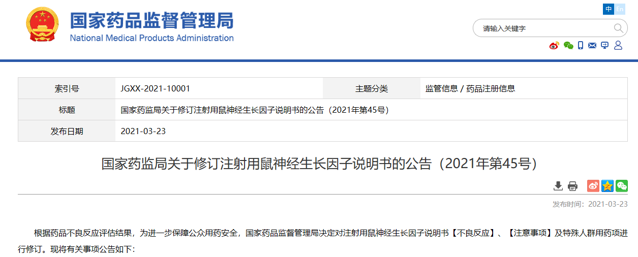 國(guó)家藥監(jiān)局關(guān)于修訂注射用鼠神經(jīng)生長(zhǎng)因子說(shuō)明書的公告(2021年第45號(hào))