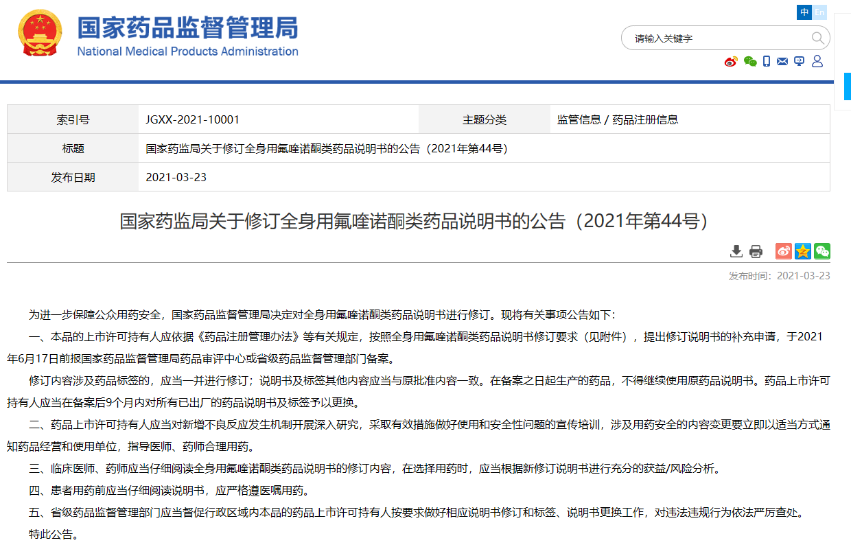 國(guó)家藥監(jiān)局關(guān)于修訂全身用氟喹諾酮類藥品說(shuō)明書的公告(2021年第44號(hào))