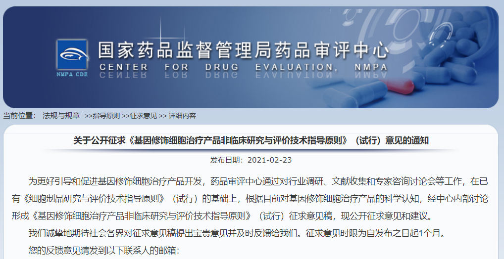 關(guān)于公開(kāi)征求《基因修飾細(xì)胞治療產(chǎn)品非臨床研究與評(píng)價(jià)技術(shù)指導(dǎo)原則》(試行)意見(jiàn)的通知