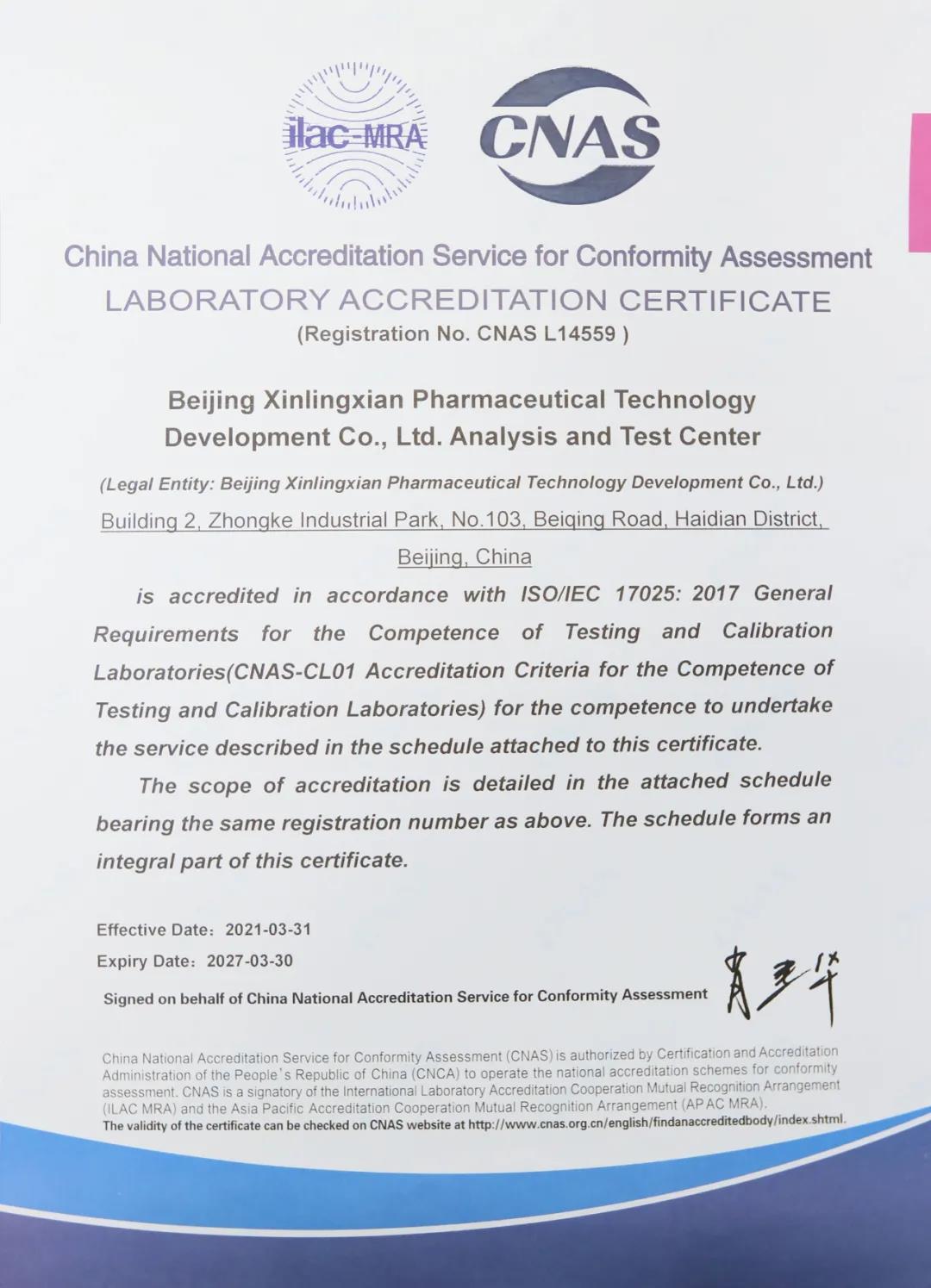 近日,新領先醫藥分析測試中心獲得中國合格評定國家認可委員會(CNAS)授予的實驗室認可證書, 這表明公司的分析測試能力及與之對應的質量管理體系獲得國際國內的權威認可,能夠為客戶提供更加專業、優質的服務,為產品的質量控制及新藥研發等提供高質量保障。
