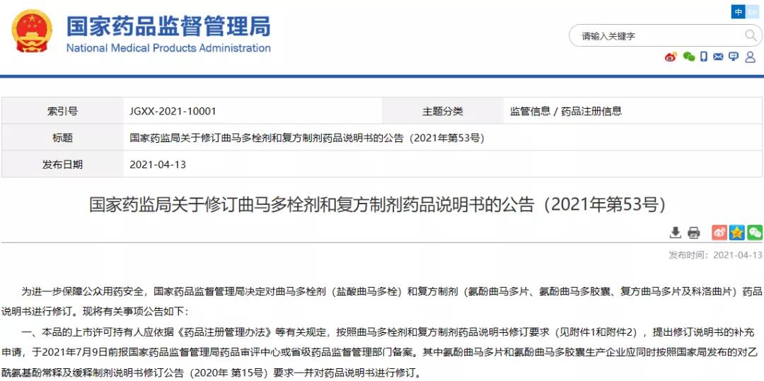 國家藥監局關于修訂曲馬多栓劑和復方制劑藥品說明書的公告(2021年第53號)