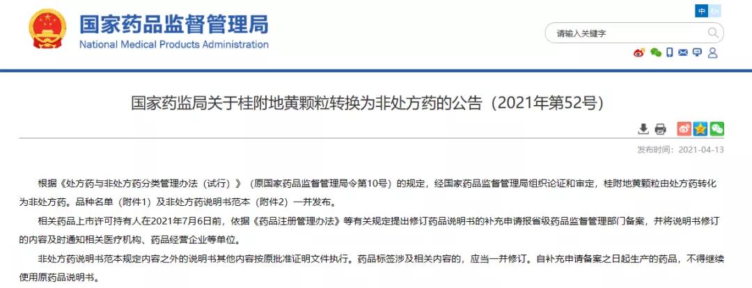 國家藥監局關于桂附地黃顆粒轉換為非處方藥的公告(2021年第52號)