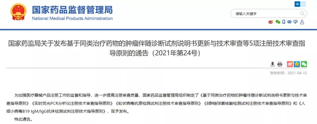 國家藥監局關于發布基于同類治療藥物的腫瘤伴隨診斷試劑說明書更新與技術審查等5項注冊技術審查指導原則的通告(2021年第24號)
