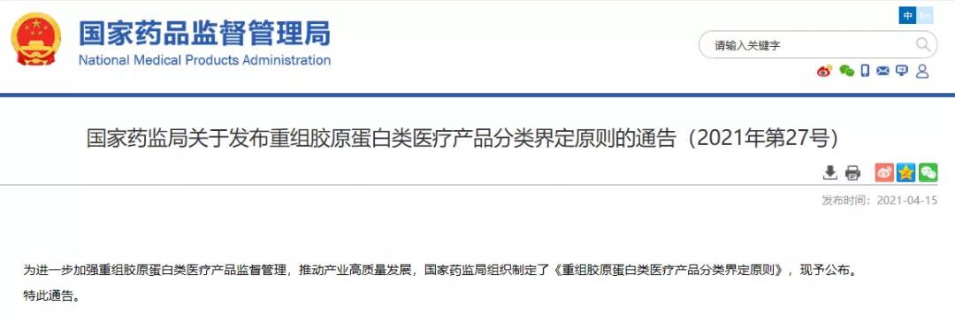 國家藥監局關于發布重組膠原蛋白類醫療產品分類界定原則的通告(2021年第27號)