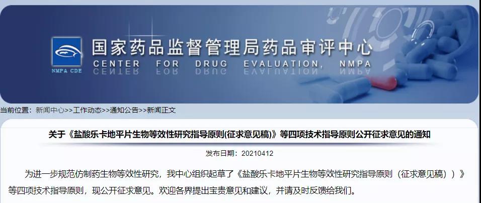 關于《鹽酸樂卡地平片生物等效性研究指導原則(征求意見稿)》等四項技術指導原則公開征求意見的通知