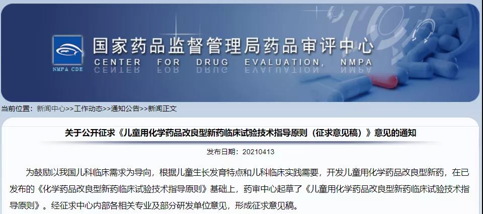 關于公開征求《兒童用化學藥品改良型新藥臨床試驗技術指導原則(征求意見稿)》意見的通知