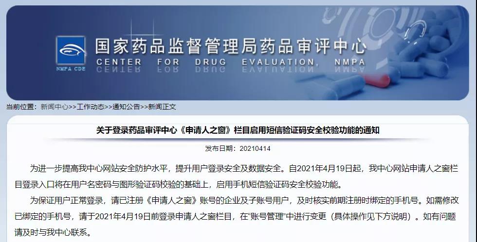關于登錄藥品審評中心《申請人之窗》欄目啟用短信驗證碼安全校驗功能的通知