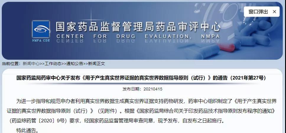 國家藥監局藥審中心關于發布《用于產生真實世界證據的真實世界數據指導原則(試行)》的通告(2021年第27號)