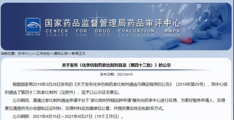 關于發布《化學仿制藥參比制劑目錄(第四十二批)》的公示