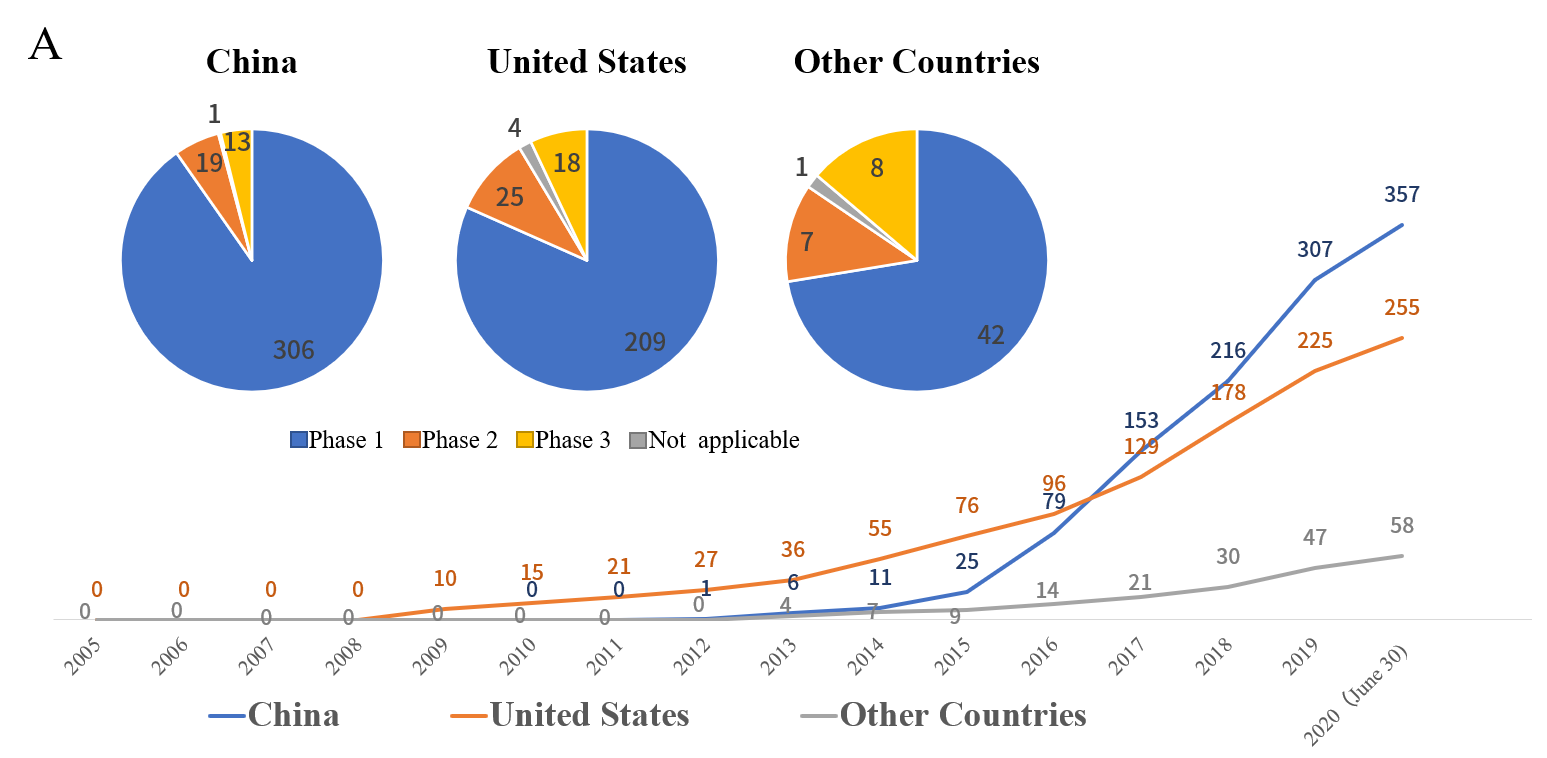 在中國的357項臨床試驗中,有306項屬于I期研究,有19項屬于II期研究,有1項進入了III期研究(于2020年注冊);在美國的256個臨床試驗中,I期、II期和III期試驗的數量分別為209、25和4;在其他國家/地區的58項臨床試驗中,I期、II期和III期試驗的數量分別為42、7和1[1]。