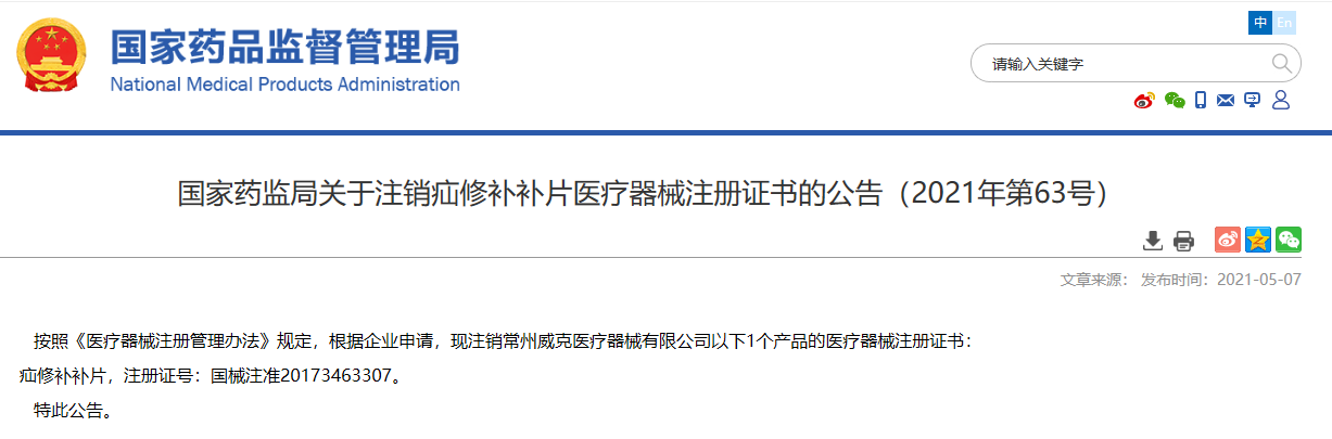 關于注銷疝修補補片醫療器械注冊證書的公告(2021年第63號)