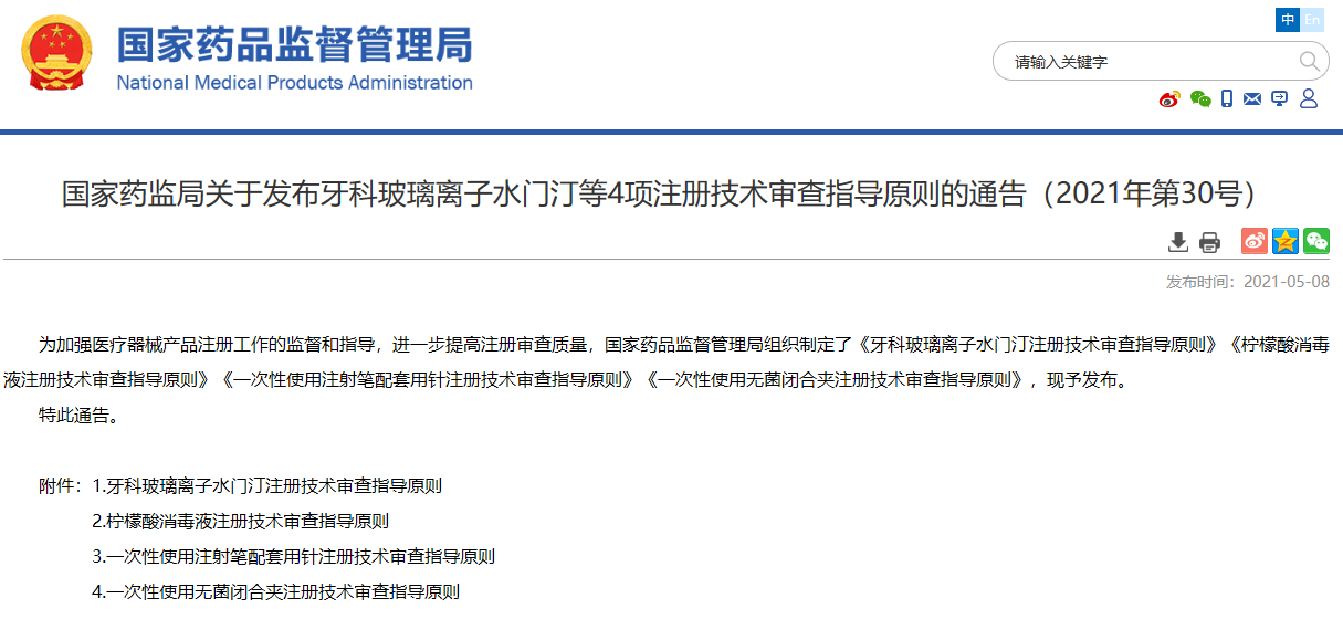 關于發布牙科玻璃離子水門汀等4項注冊技術審查指導原則的通告(2021年第30號)
