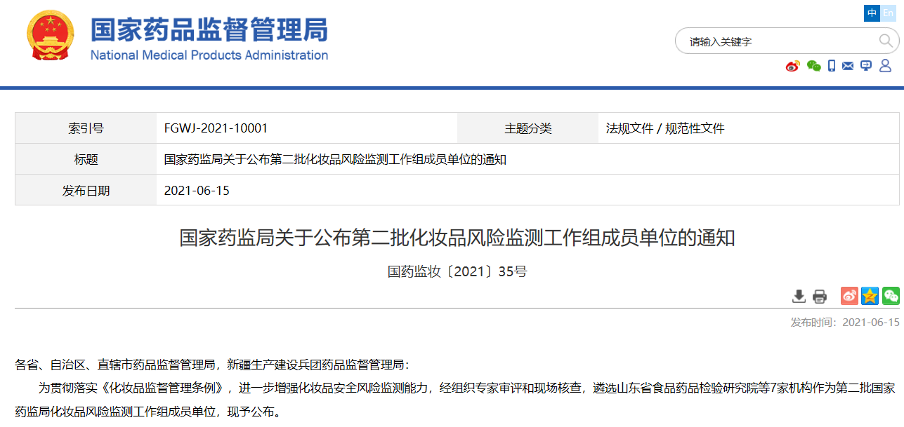 國家藥監局關于公布第二批化妝品風險監測工作組成員單位的通知