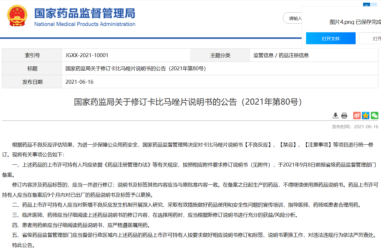 國家藥監局關于修訂卡比馬唑片說明書的公告(2021年第80號)