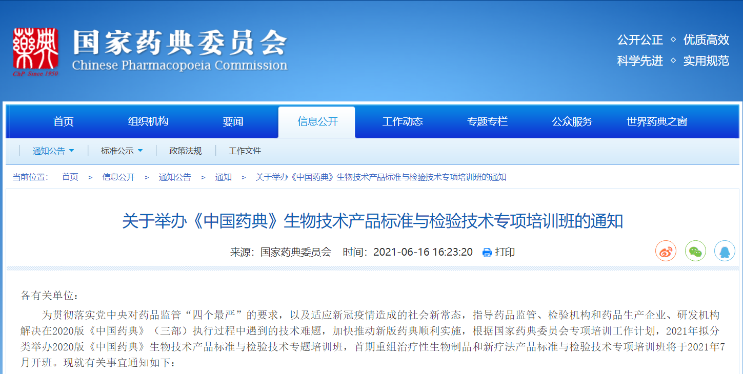 關于舉辦《中國藥典》生物技術產品標準與檢驗技術專項培訓班的通知