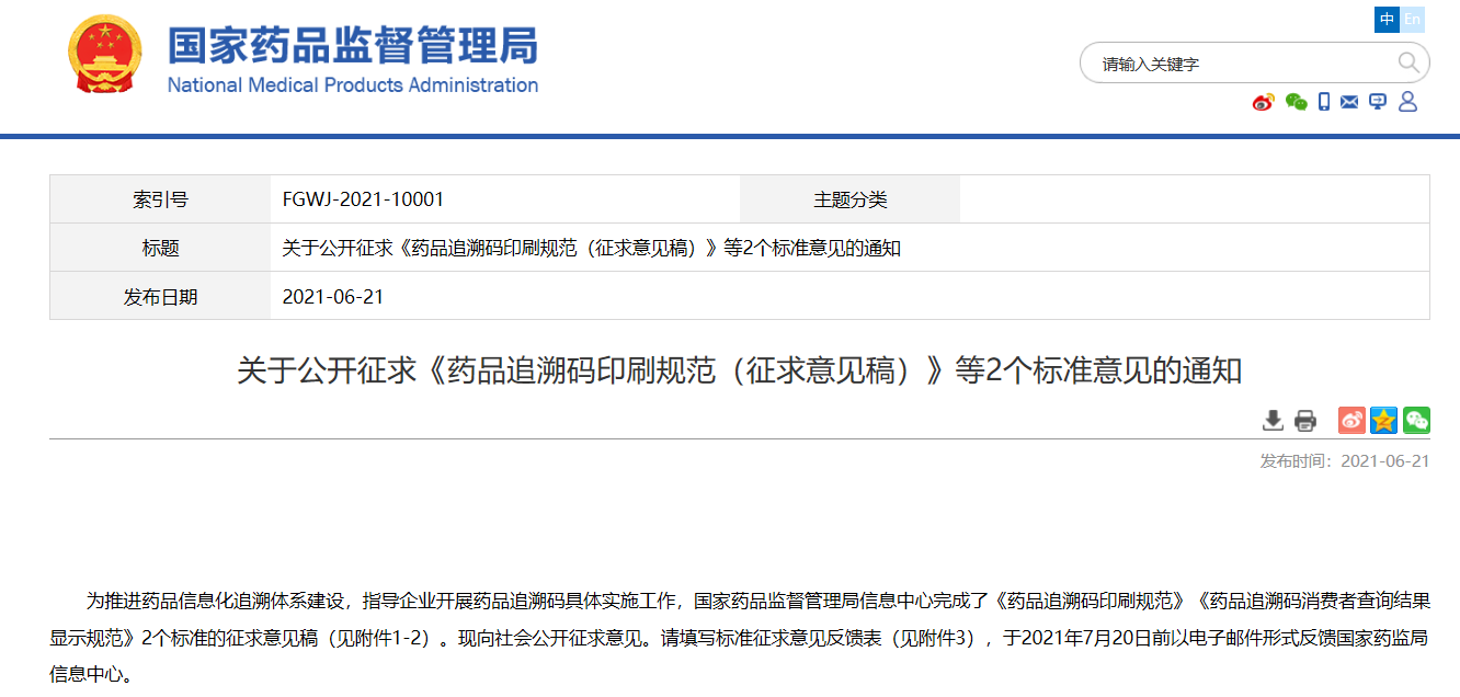 關于公開征求《藥品追溯碼印刷規范(征求意見稿)》等2個標準意見的通知