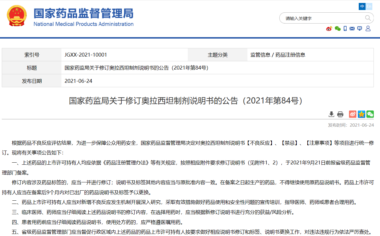 國家藥監局關于修訂奧拉西坦制劑說明書的公告(2021年第84號)