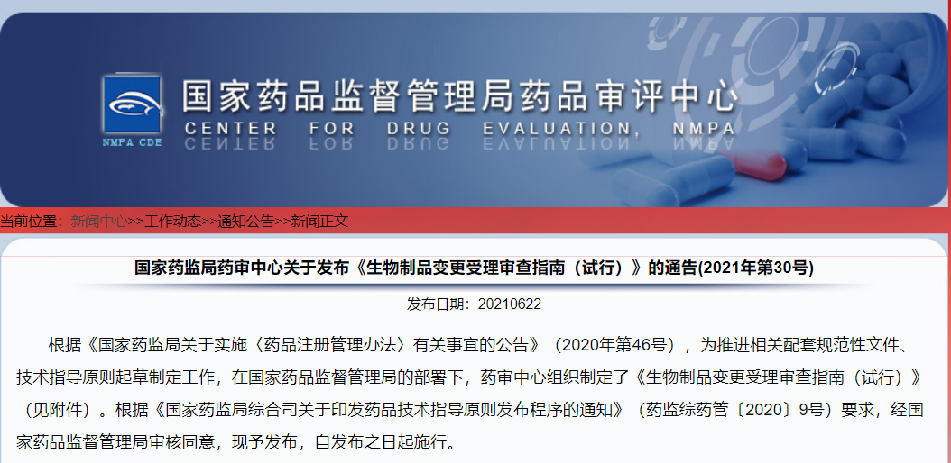 國家藥監局藥審中心關于發布《生物制品變更受理審查指南(試行)》的通告(2021年第30號)