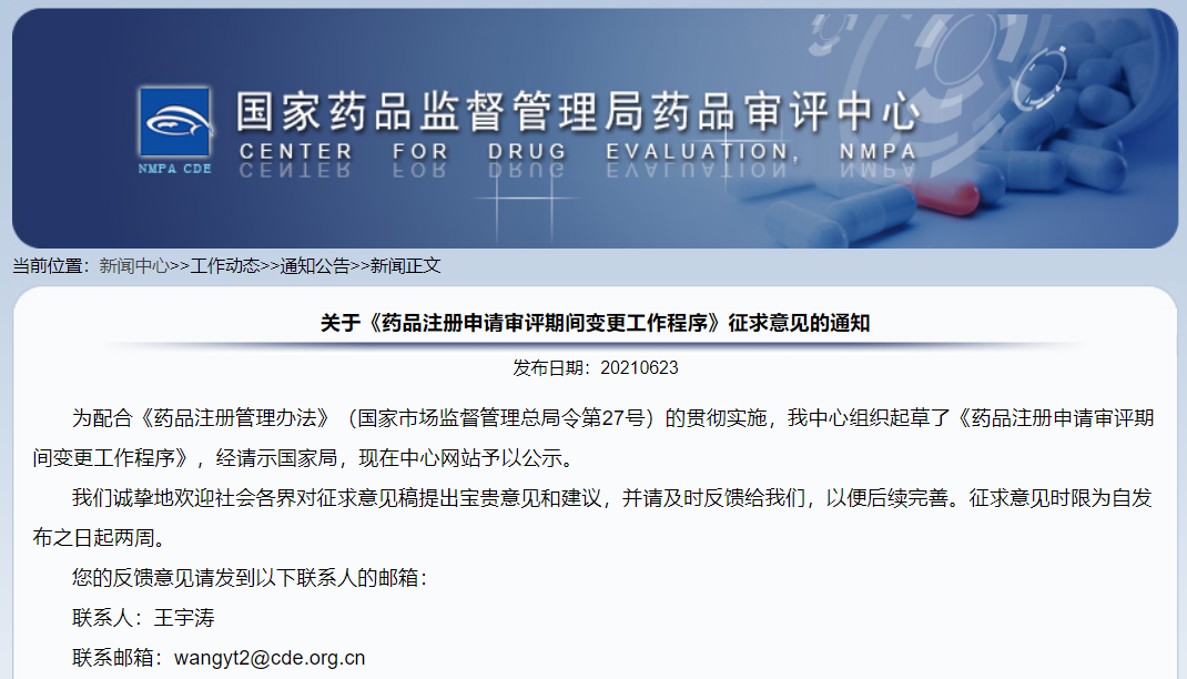 關于《藥品注冊申請審評期間變更工作程序》征求意見的通知