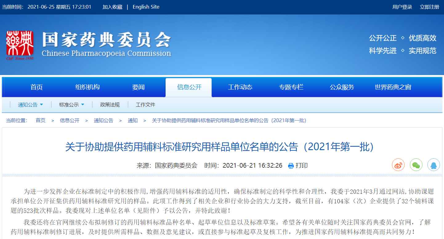 關于協助提供藥用輔料標準研究用樣品單位名單的公告(2021年第一批)
