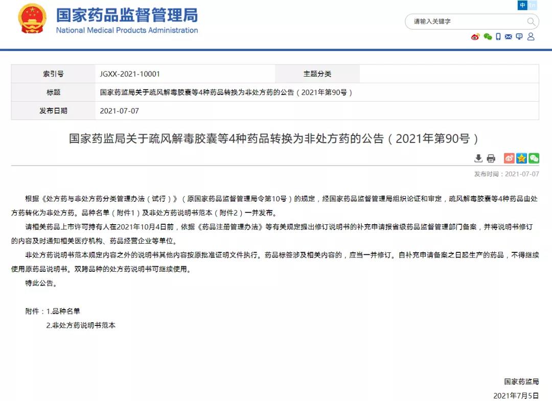 國家藥監(jiān)局關(guān)于疏風(fēng)解毒膠囊等4種藥品轉(zhuǎn)換為非處方藥的公告(2021年第90號) (2021-07-07)