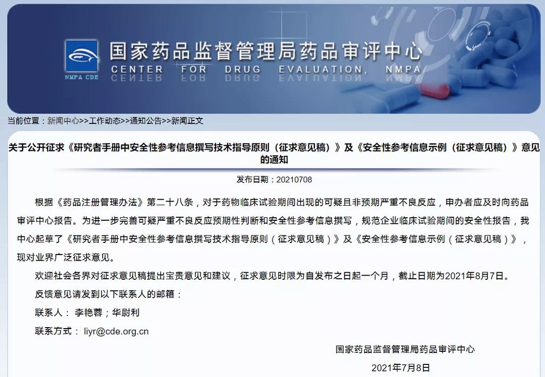 關(guān)于公開征求《研究者手冊中安全性參考信息撰寫技術(shù)指導(dǎo)原則(征求意見稿)》及《安全性參考信息示例(征求意見稿)》意見的通知