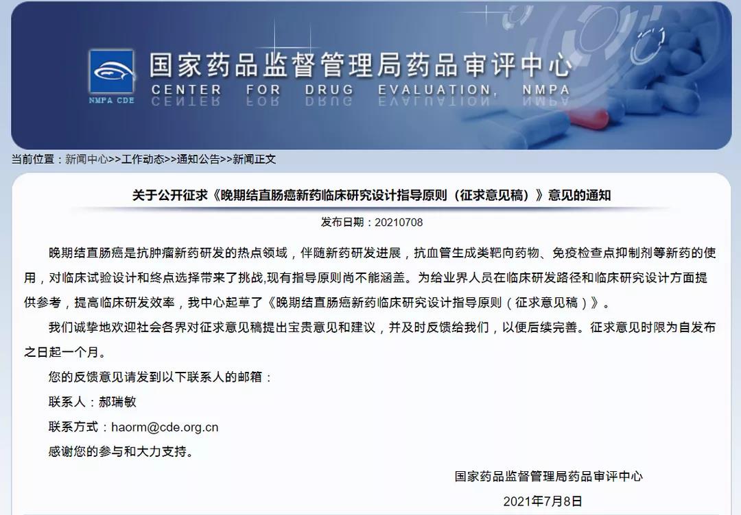 關(guān)于公開征求《晚期結(jié)直腸癌新藥臨床研究設(shè)計(jì)指導(dǎo)原則(征求意見稿)》意見的通知