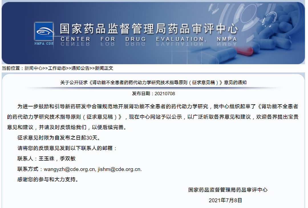 關(guān)于公開征求《腎功能不全患者的藥代動(dòng)力學(xué)研究技術(shù)指導(dǎo)原則(征求意見稿)》意見的通知