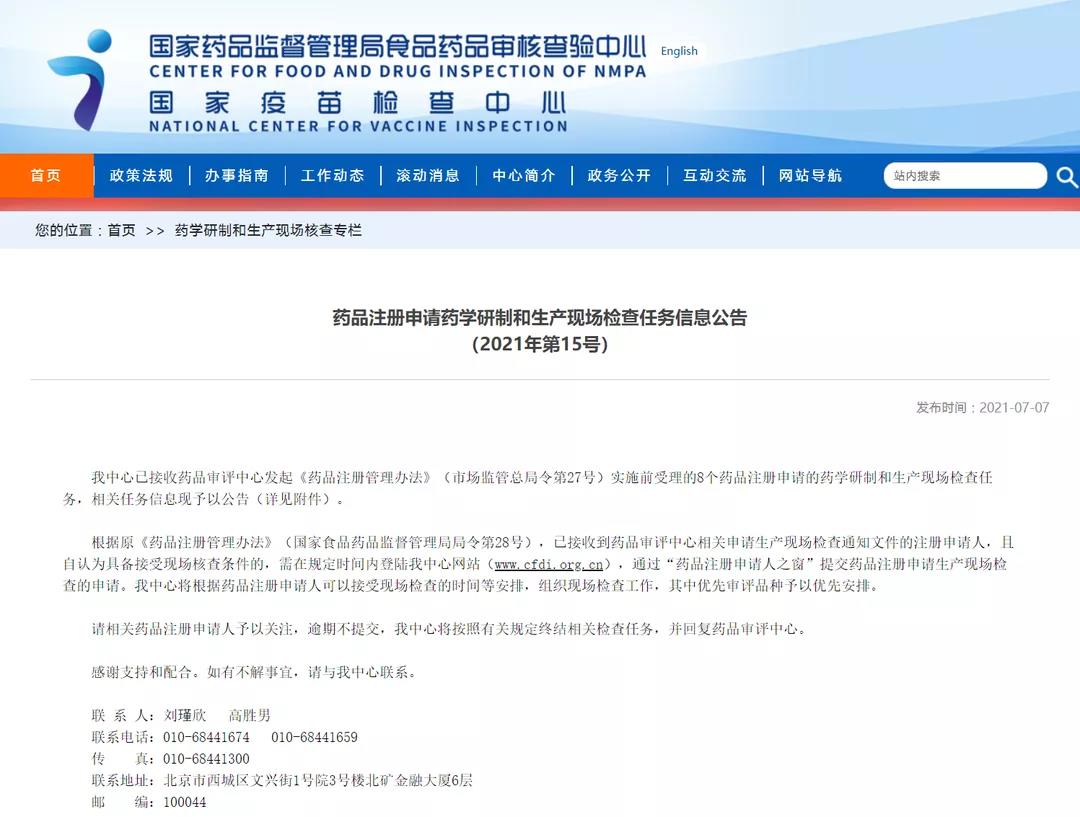 藥品注冊申請藥學(xué)研制和生產(chǎn)現(xiàn)場檢查任務(wù)信息公告(2021年第15號)
