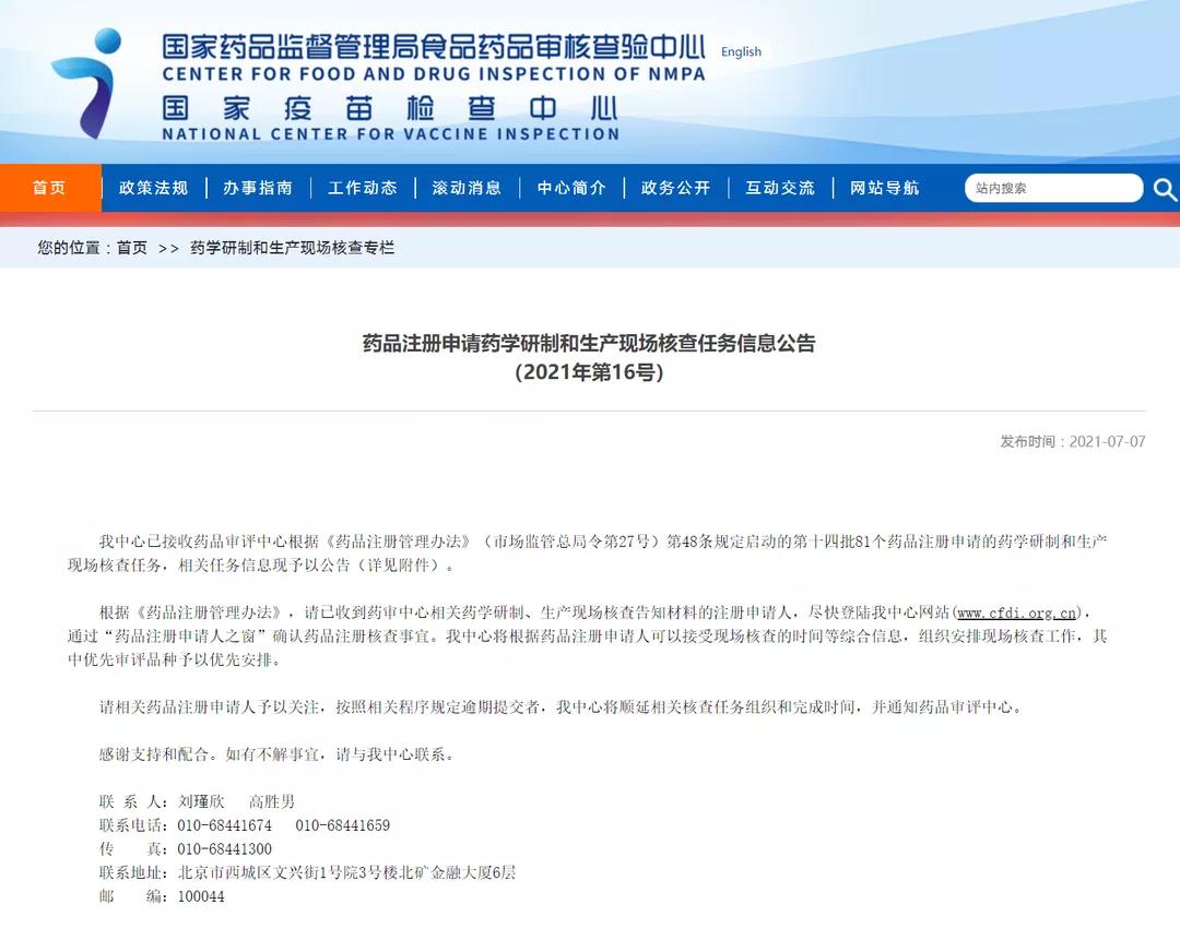 藥品注冊申請藥學(xué)研制和生產(chǎn)現(xiàn)場核查任務(wù)信息公告(2021年第16號)